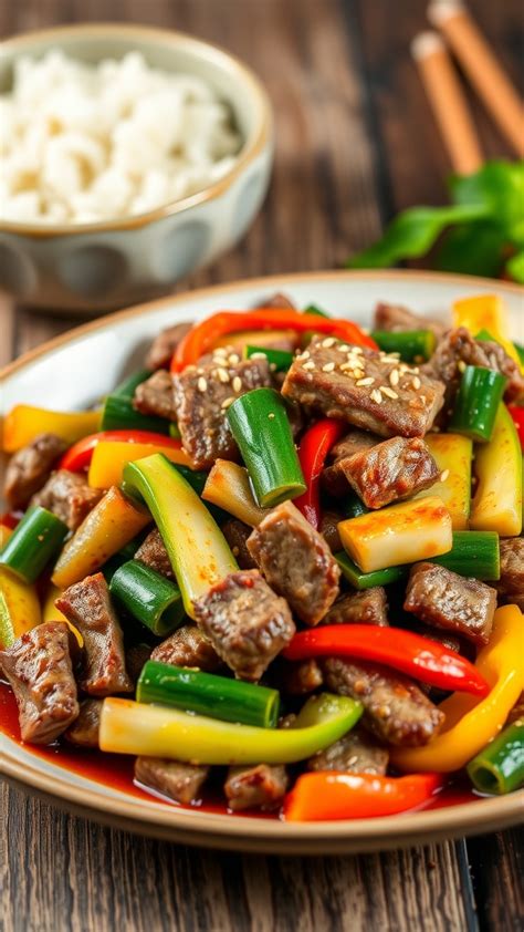 Beef Zucchini Stir Fry. Remove from pan/wok with a slotted spoon and set aside. Season with green onion, sesame.