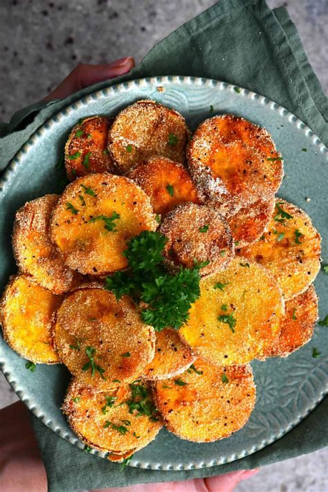 Web yellow squash slices are coated in a mixture of creamy salad dressing and parmesan cheese, then they're fried to.