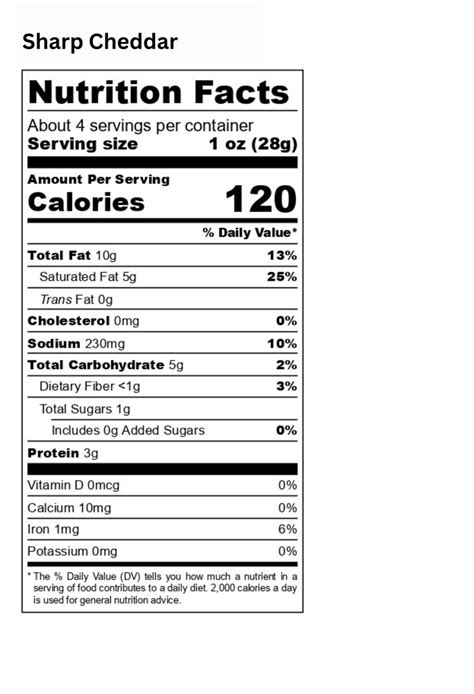 Sharp Cheddar Calories. % daily value* total fat 9.6g 12% saturated fat 5.5g 28% trans fat. Fiber 0 g 0% dv.