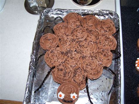 Spider Cupcake Cake. Bake cake as directed on box for cupcakes, using water, oil and eggs. A simple yet impressive design that can be made with or without a metal.