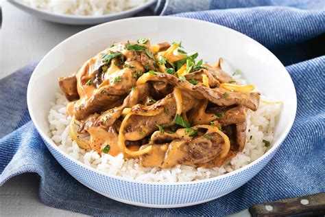 Stroganoff Over Rice. 1 lb beef (sirloin or flank steak), thinly sliced. Round steak, cut into thin strips.